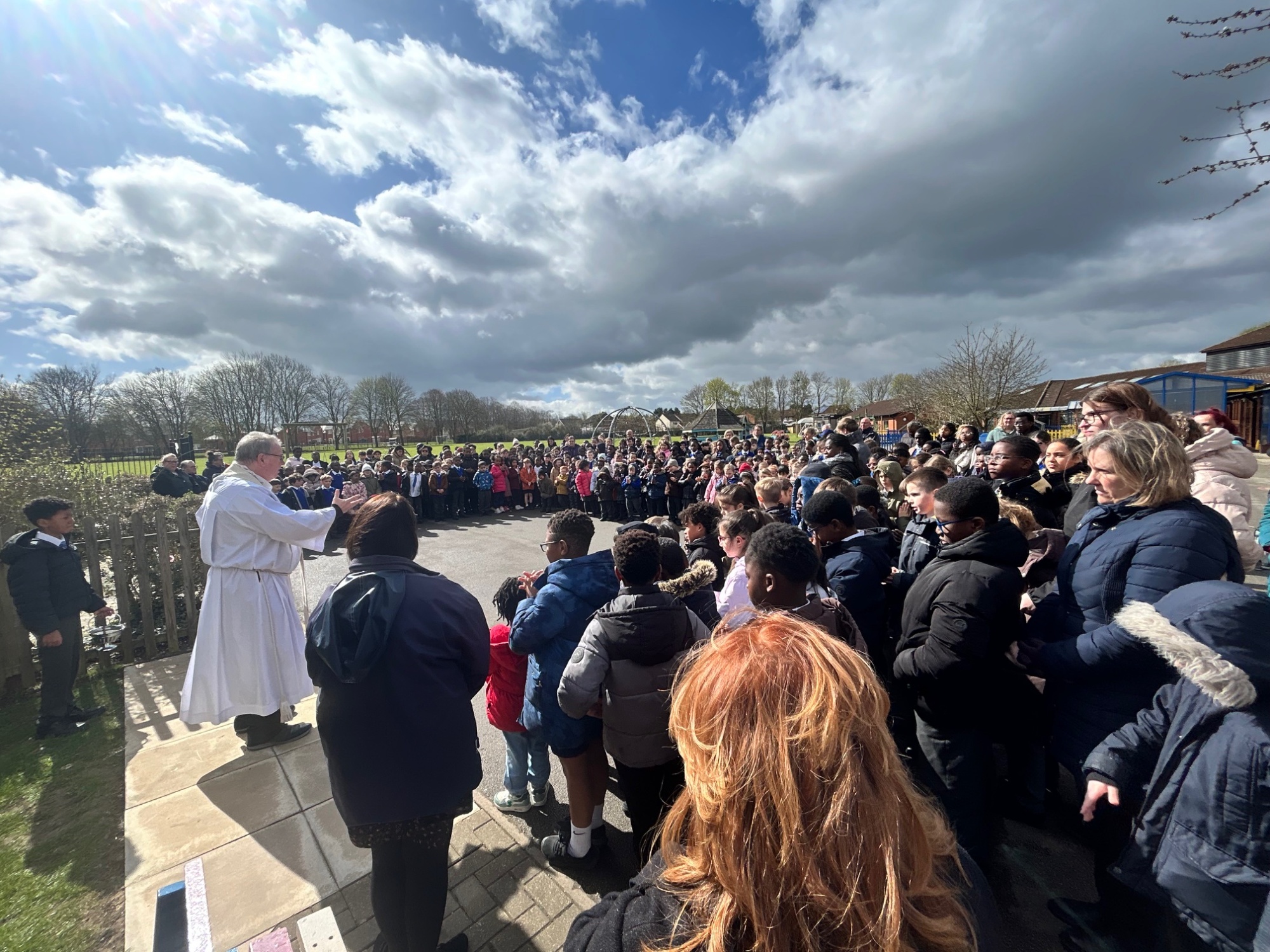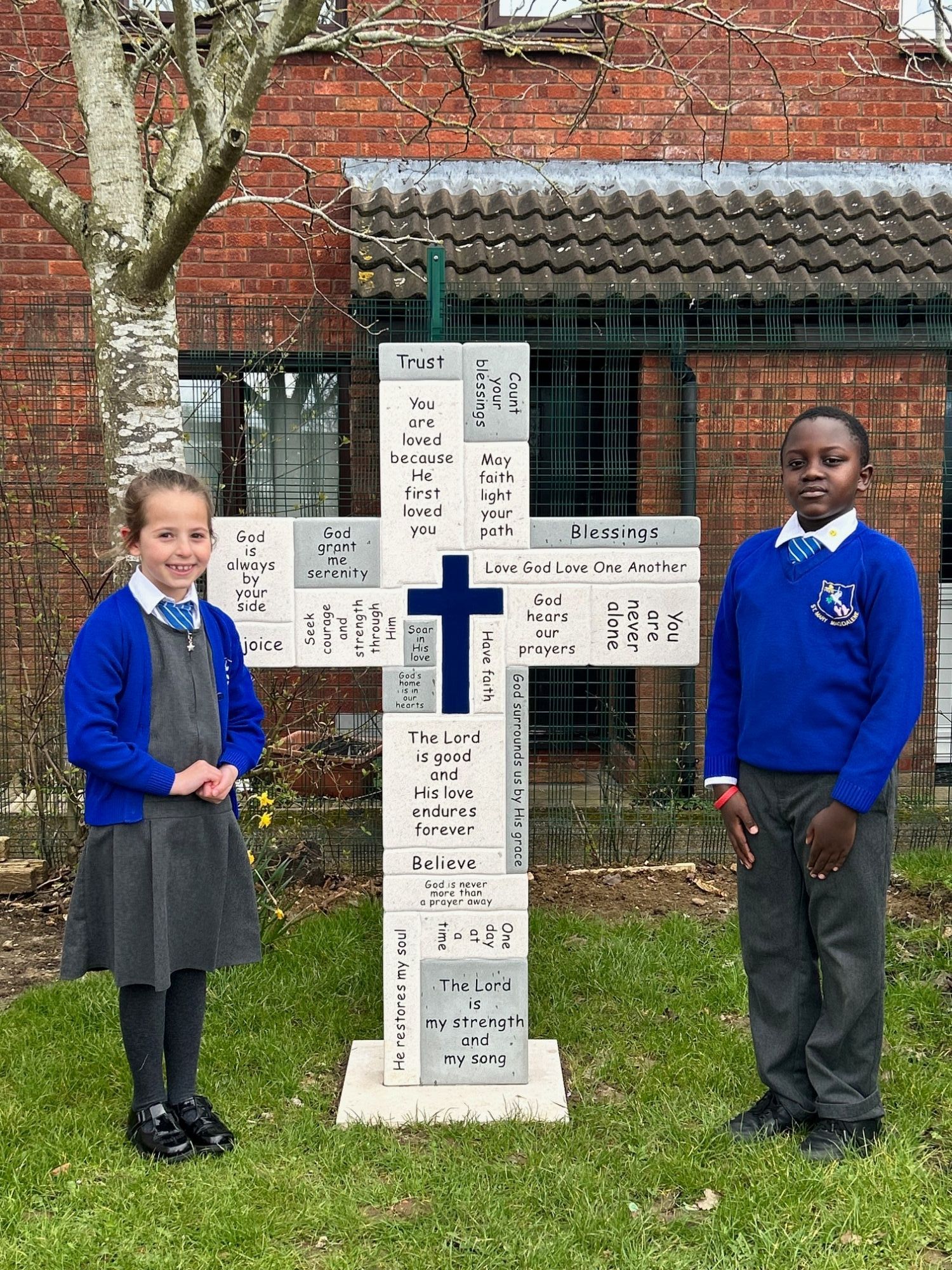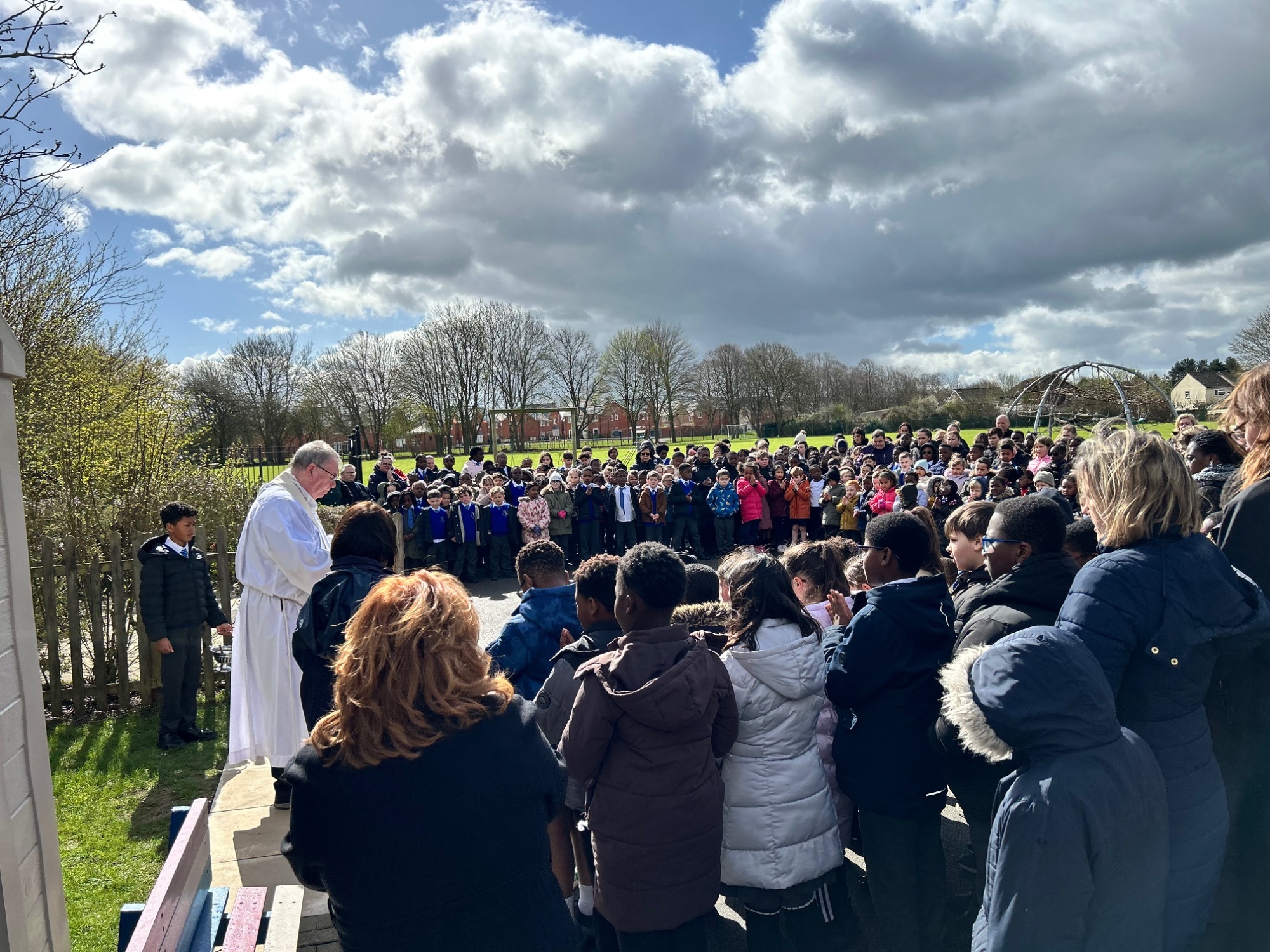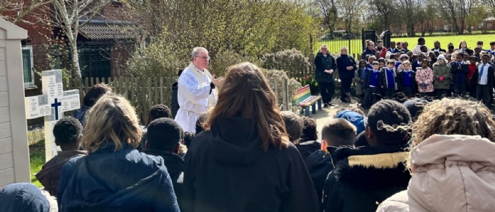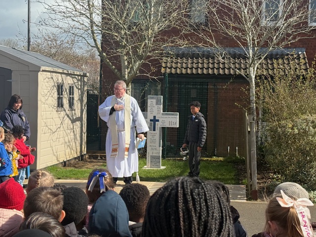Today Father Bernard attended school to bless our beautiful new cross which we had commissioned to celebrate our 40th birthday. The whole school including some of our governors attended.